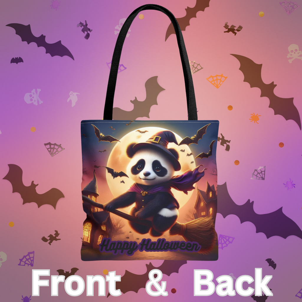 Cute and magical Tote Bag featuring an adorable Panda Wizard flying on a broom. Perfect for kids during Halloween, adding a fun and whimsical touch to their trick-or-treating adventures. Ideal for those who love cute animal designs and want a medium sized tote for everyday use.