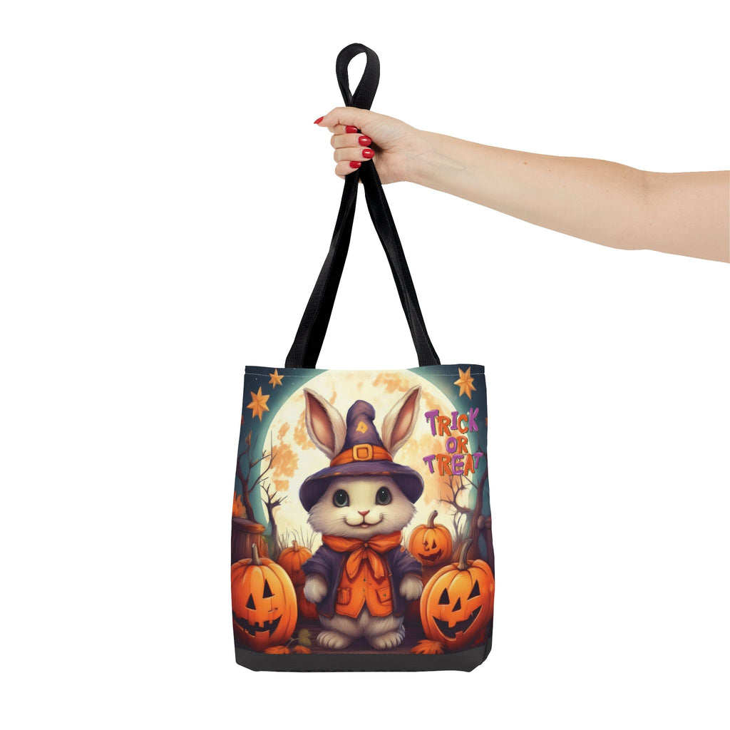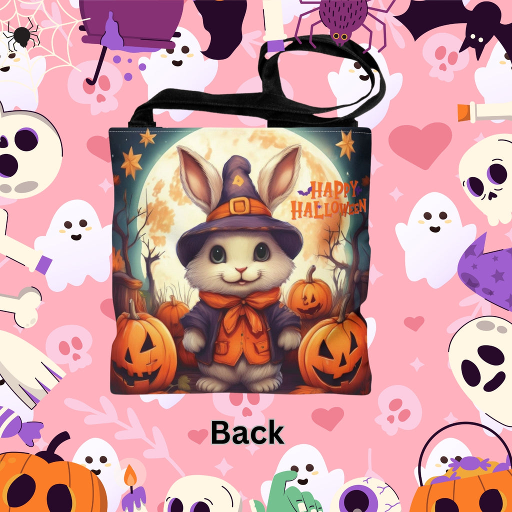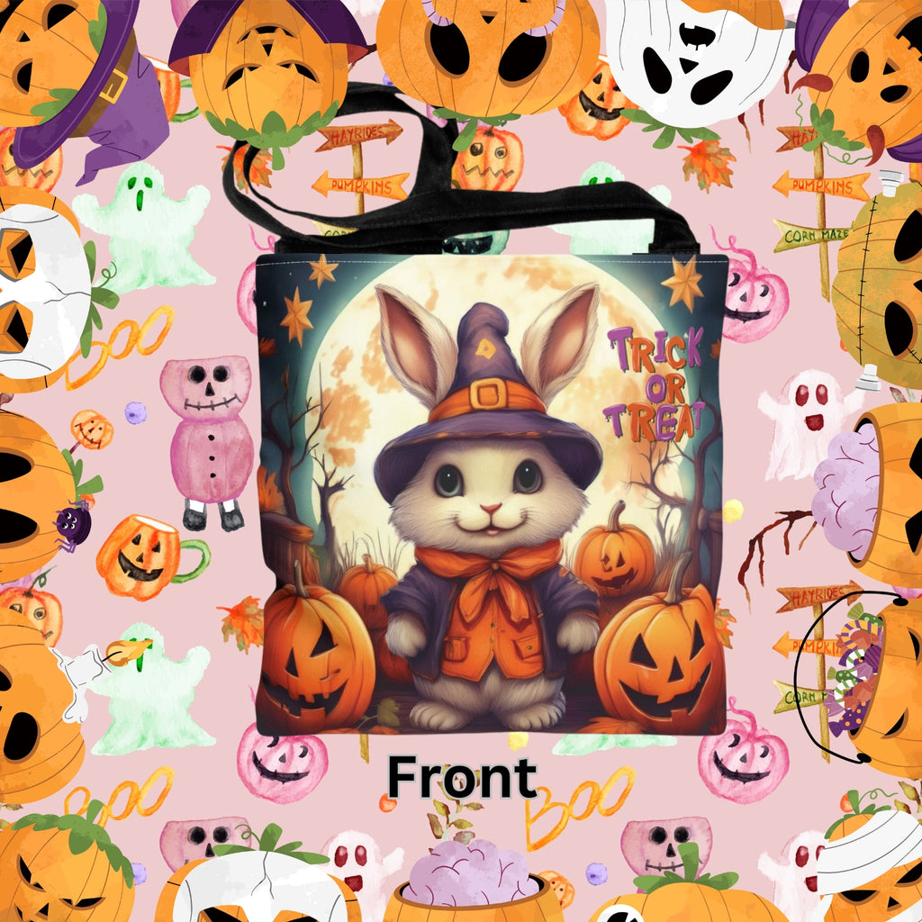 Halloween Kids & Toddlers Tote Bag with Adorable small bunny Design. Perfect for trick-or-treating, this cute candy bag features a favourite animal in a Halloween costume for a child's spooky delight. Ideal for young children celebrating Halloween and looking to collect their treats in style.