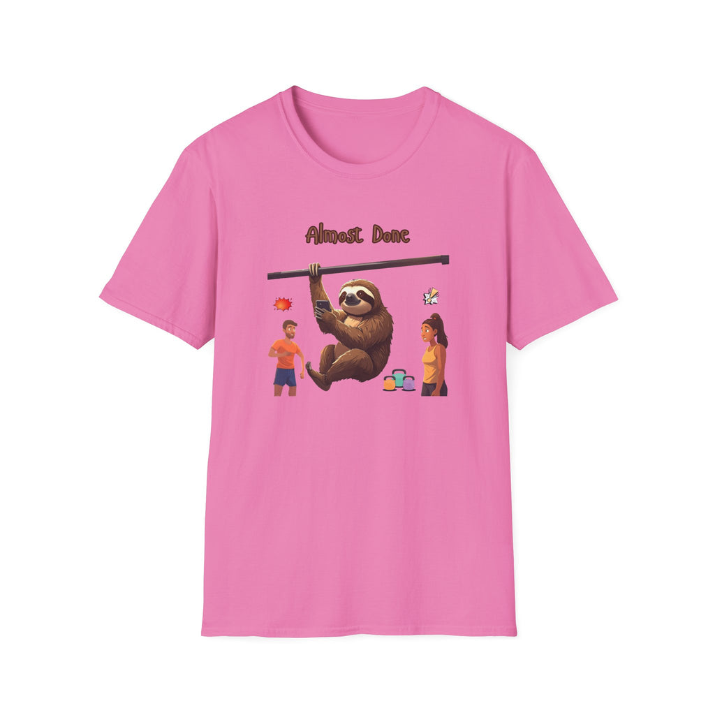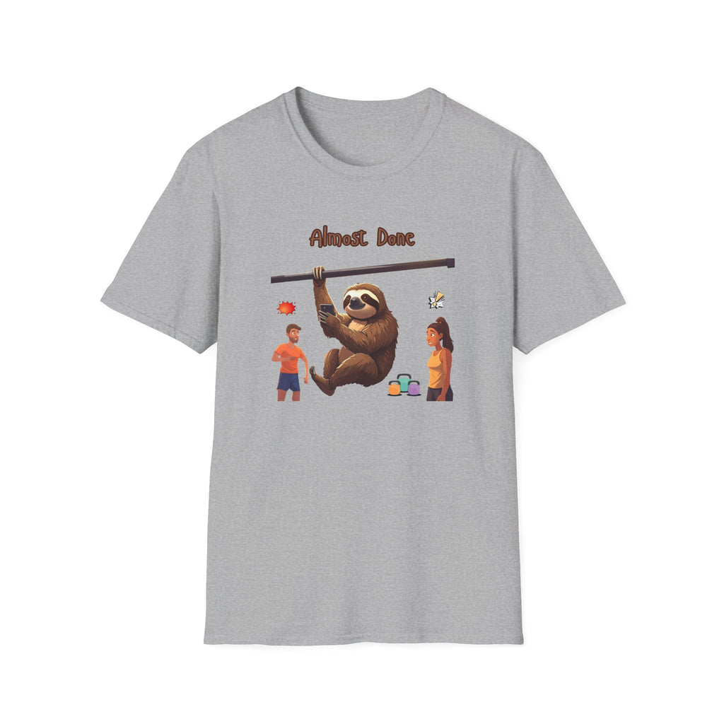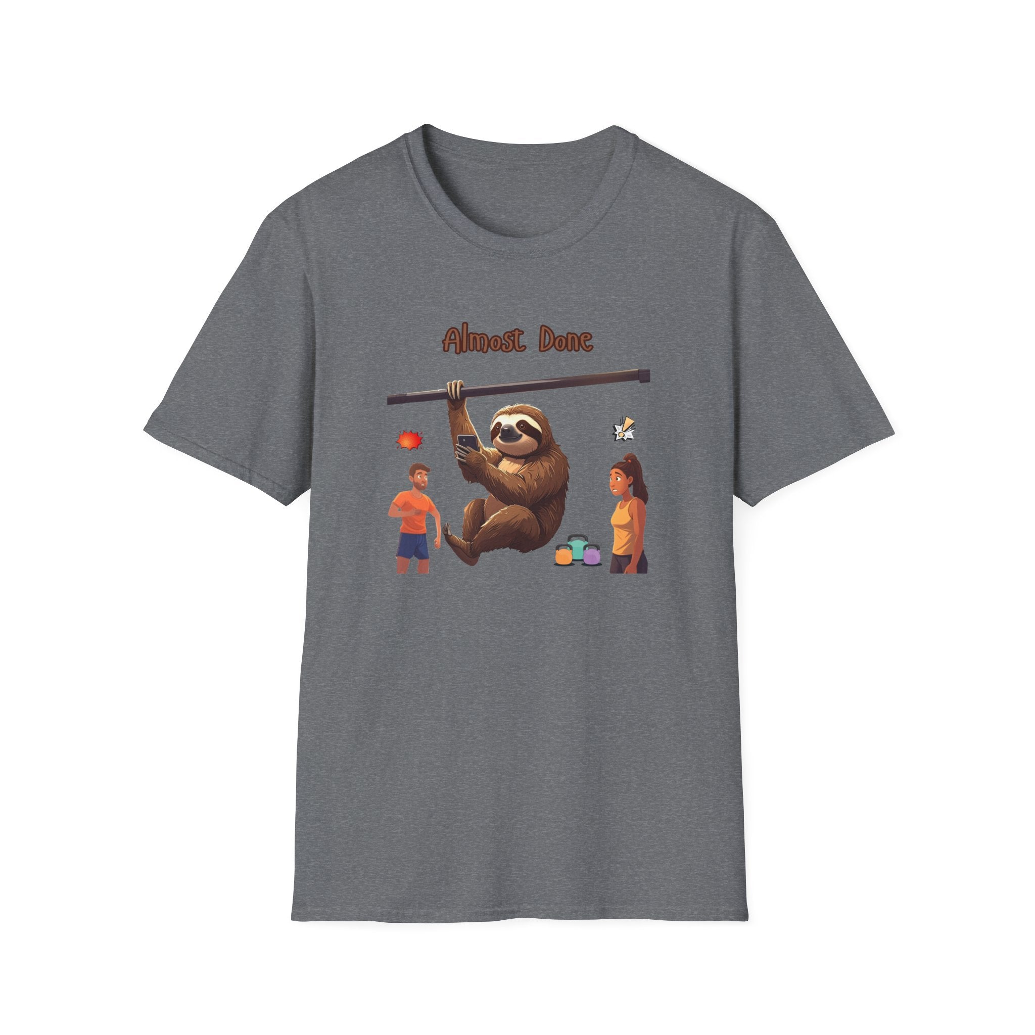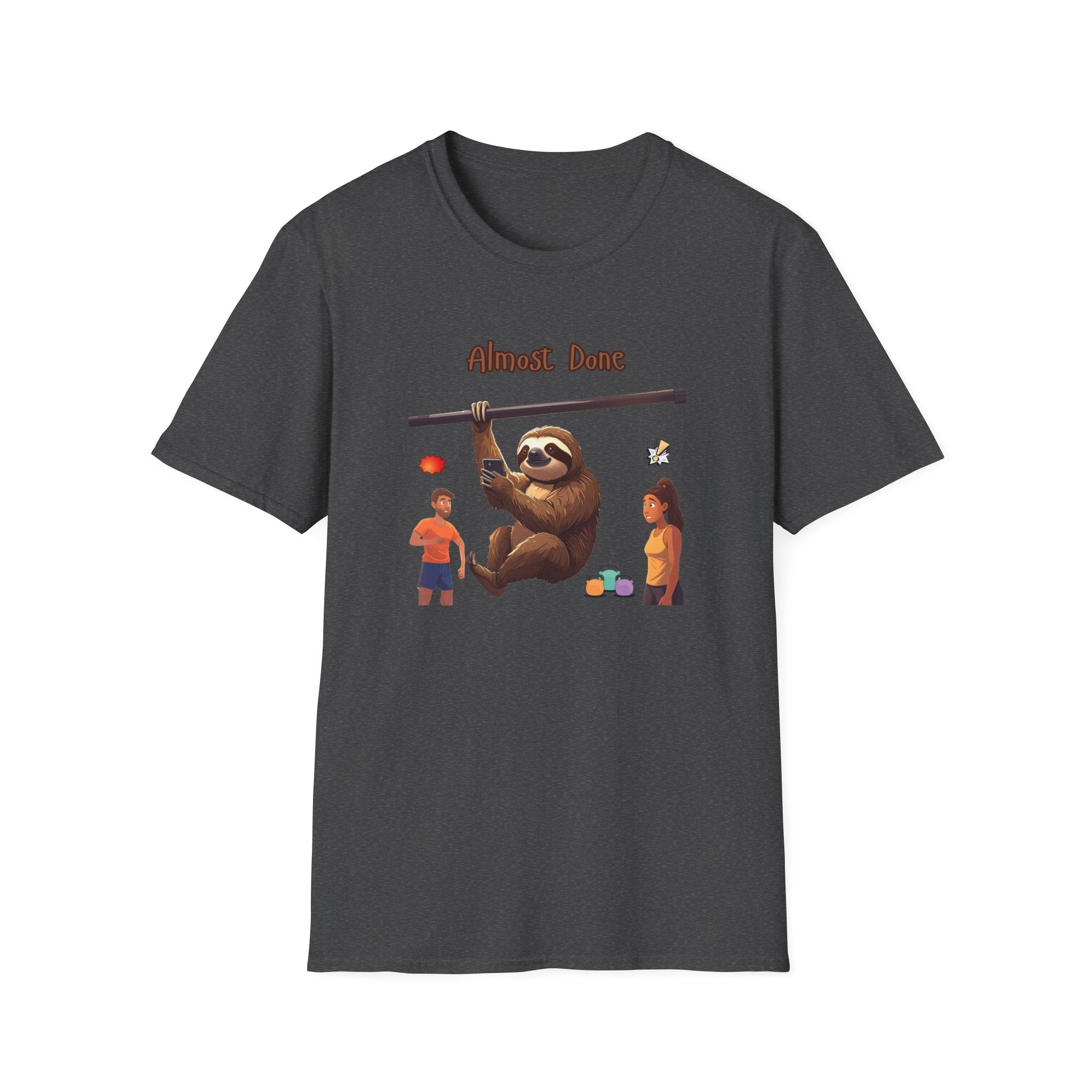 A cute and funny unisex T-shirt featuring a sloth on a phone while hanging on a chin-up bar. Perfect for those who love adorable designs and enjoy working out. This T-shirt is ideal for casual wear or as a conversation starter at the gym. Relevant for gym-goers, animal lovers, and those who appreciate quirky designs. Suitable for casual wear, gym sessions, or as a unique gift for birthdays or holidays like Christmas and birthdays.