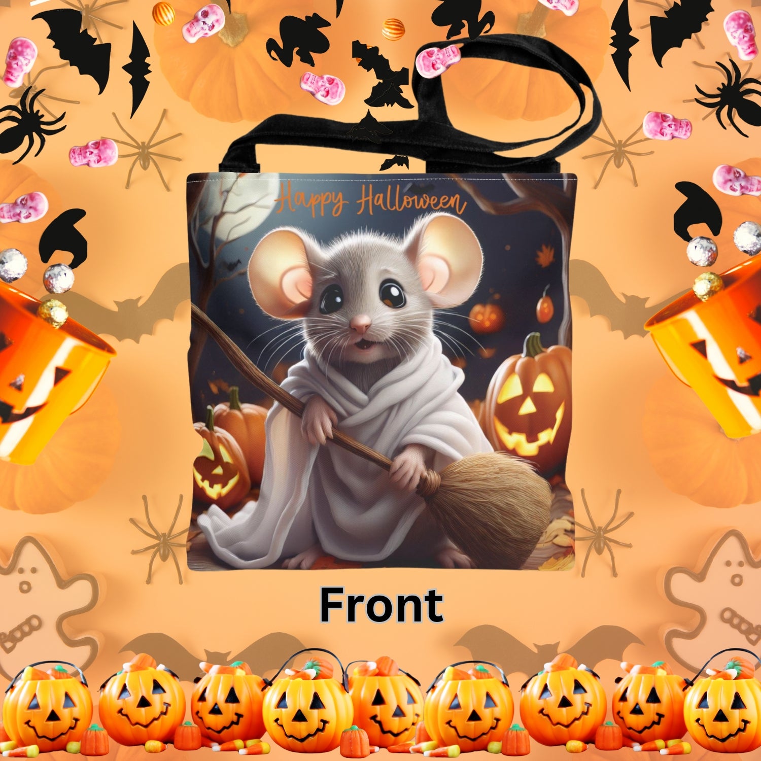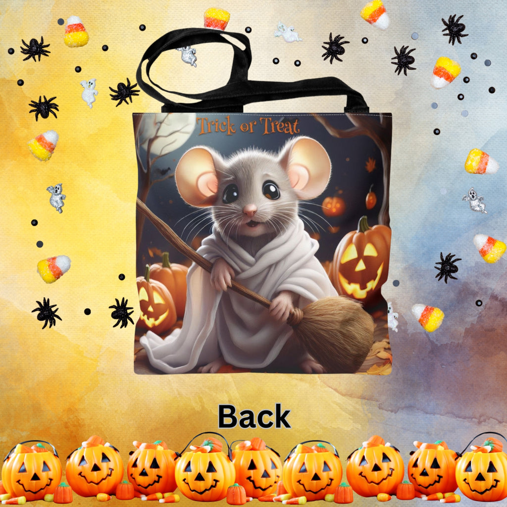 Halloween Kids Tote Bag featuring an Adorable Mouse with a broom Design, perfect for children's spooky delight. This adorable candy bag with favourite animal in costume is a must-have for Halloween celebrations and trick-or-treating.