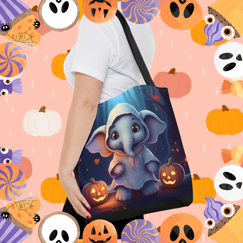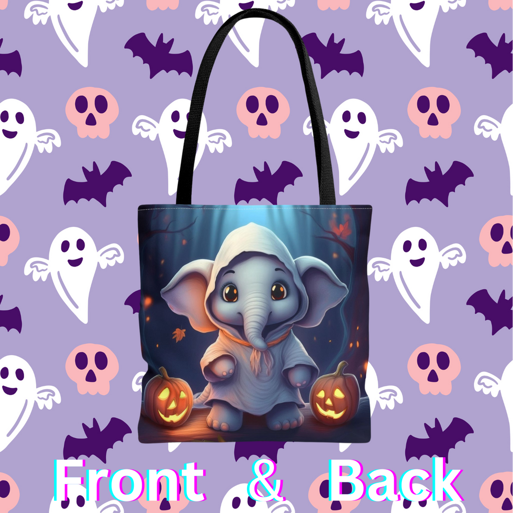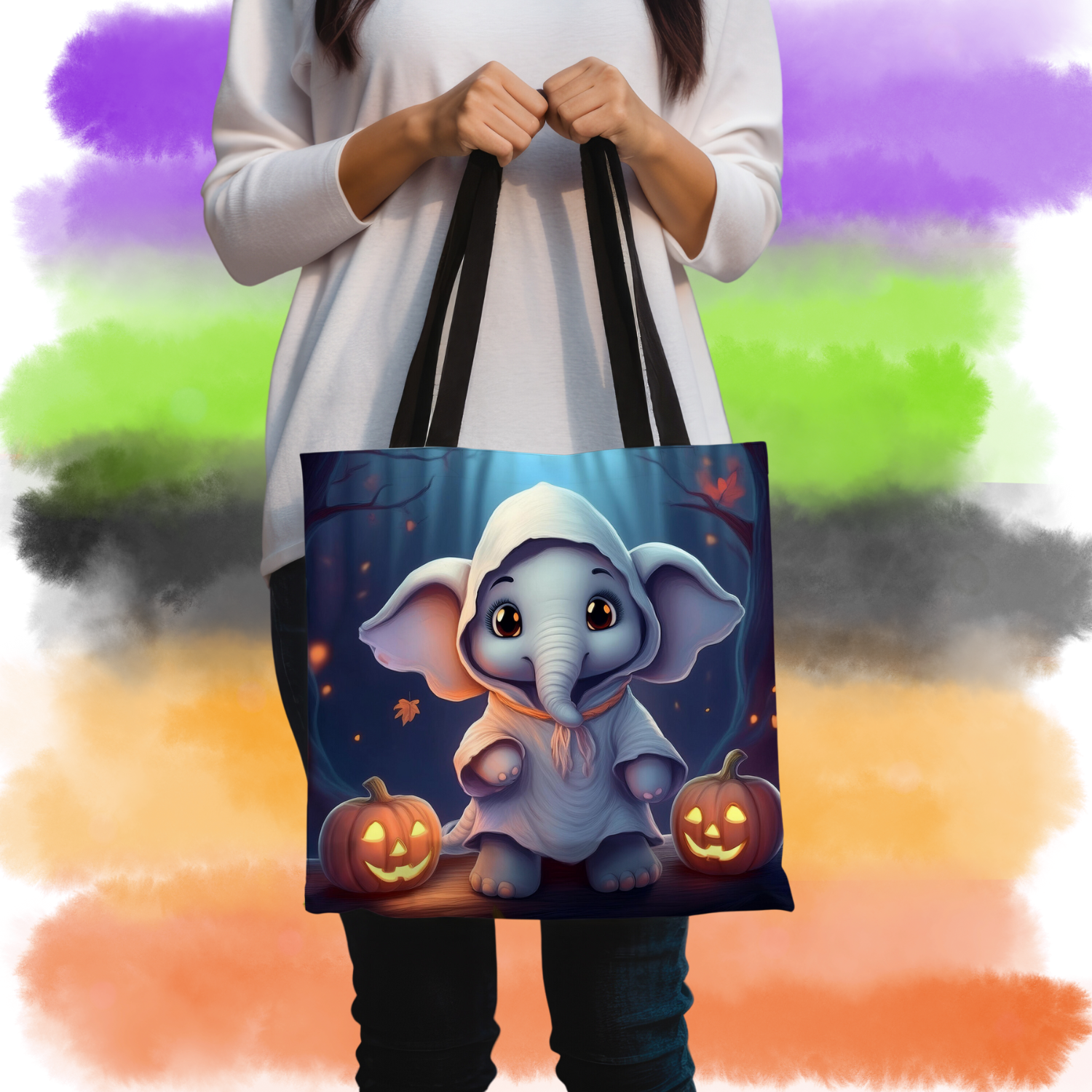 An adorable medium tote featuring the most sweetest baby elephant in an adorable ghost costume, perfect for Halloween. This tote is made with durable polyester fabric, reinforced stitching on handles, and boxed corners for extra room. Ideal for those who love cute and festive designs for Halloween.